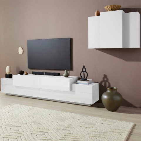 Tämän tyylikkään olohuonekokoonpanon erityispiirre on ehdottomasti sen moderni muotoilu, joka ilmentää 100% italialaista tyyliä ja käsityötä. Se on valmistettu Italiassa korkealaatuisesta puusta, joka on sekä tukeva että kestävä, ja koostuu monista käytännöllisistä osista. Seinäyksikkö sisältää laajan TV-tason (240x45cm), jossa on saranaovet ja neljä erikokoista lokeroa. Voit käyttää sitä televisiolle tai palvelukalusteena, jos päätät kiinnittää televisiosi seinälle. Lisäksi mukana on käytännöllinen, tilava ja samaa linjaa edustava ripustettu yläkaappi, joka sopii erinomaisesti erilaisten tavaroiden säilyttämiseen pölyltä suojassa. Stady-olohuoneseinäyksikkö on saatavilla myös muissa vaihtoehdoissa, jotta se sopii täydellisesti mihin tahansa sisustustyyliin ja makuun. Tutustu verkkoluetteloomme ja valitse suosikkisi!